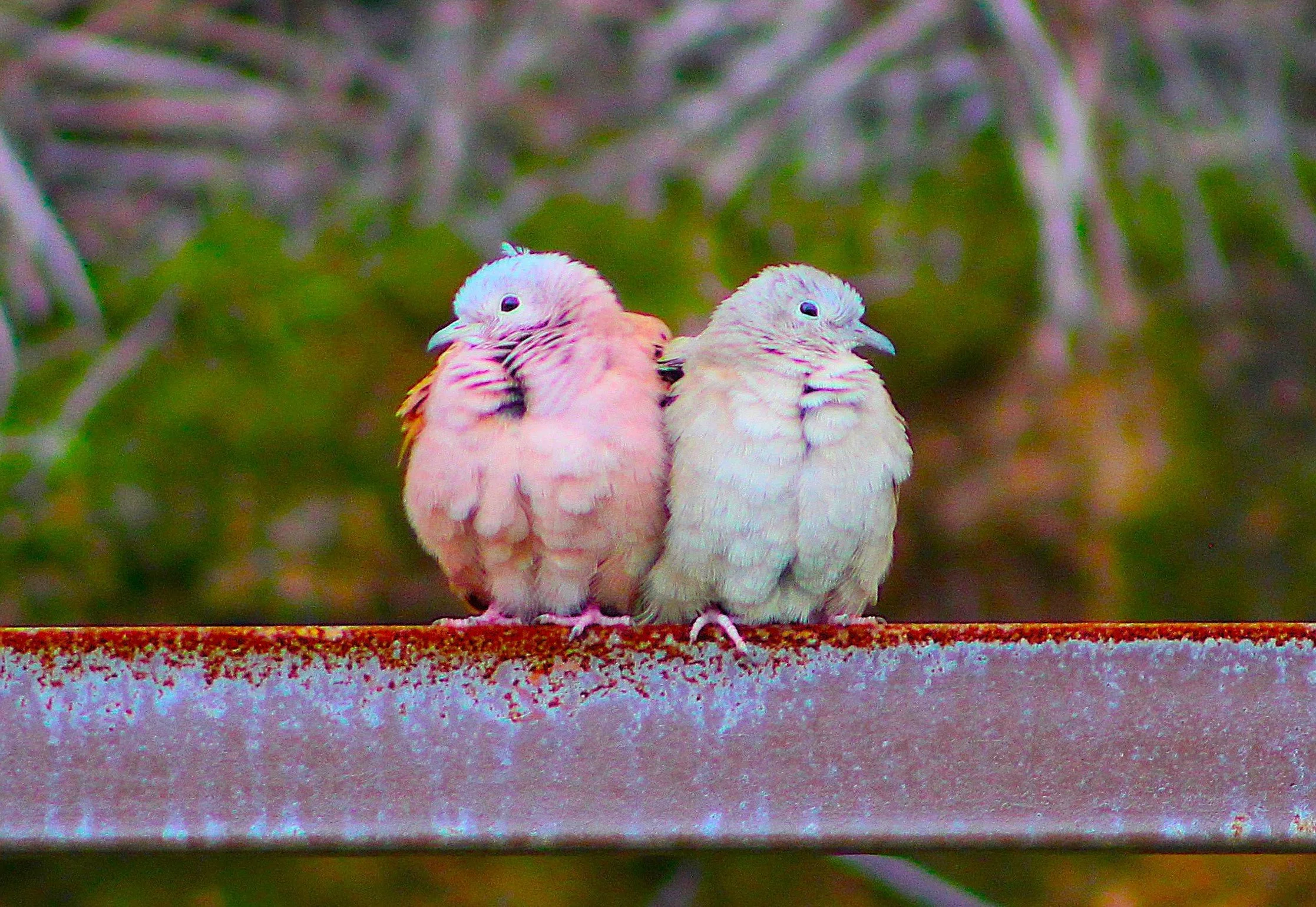 La paleta cromática, dominada por tonos cálidos y terrosos, se combina con el verde atenuado del fondo y la textura oxidada del metal, creando un contraste visual que potencia la suavidad del plumaje y refuerza la calidez de la escena.